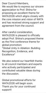 総会テーマを事務局が募集し4つの提案がありました。理事による投票の結果、私が提案した “Global Unity in Ablation: Building Recognition, Evidence, and Excellence” が選ばれました。